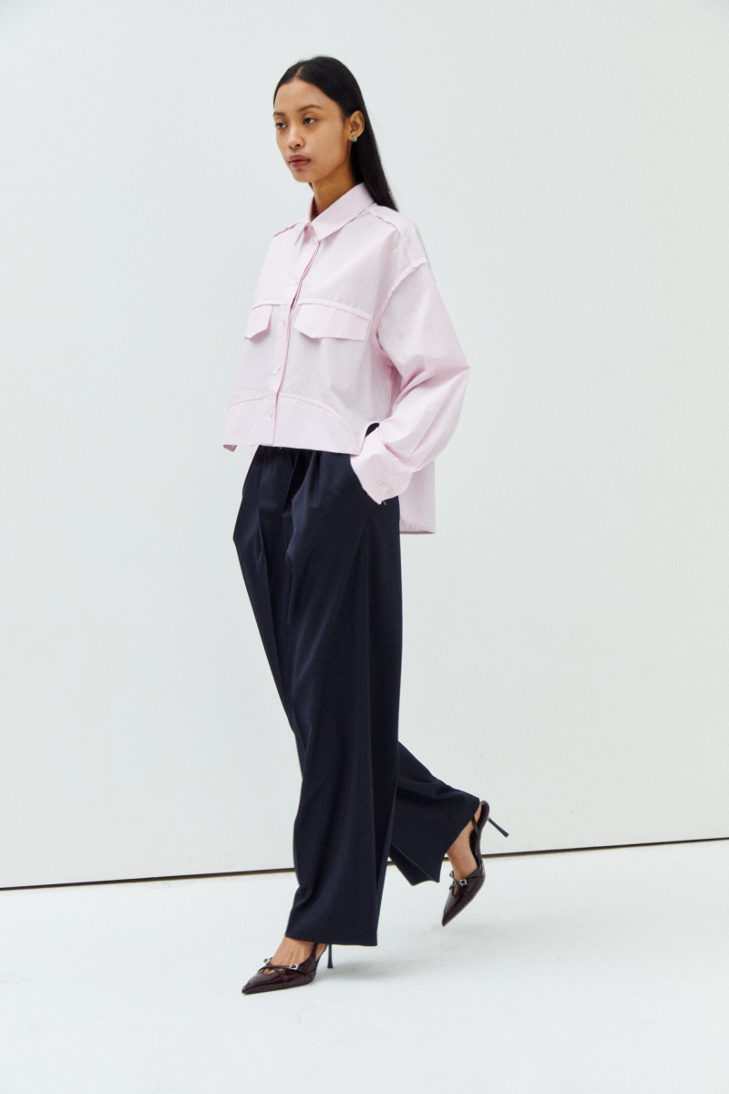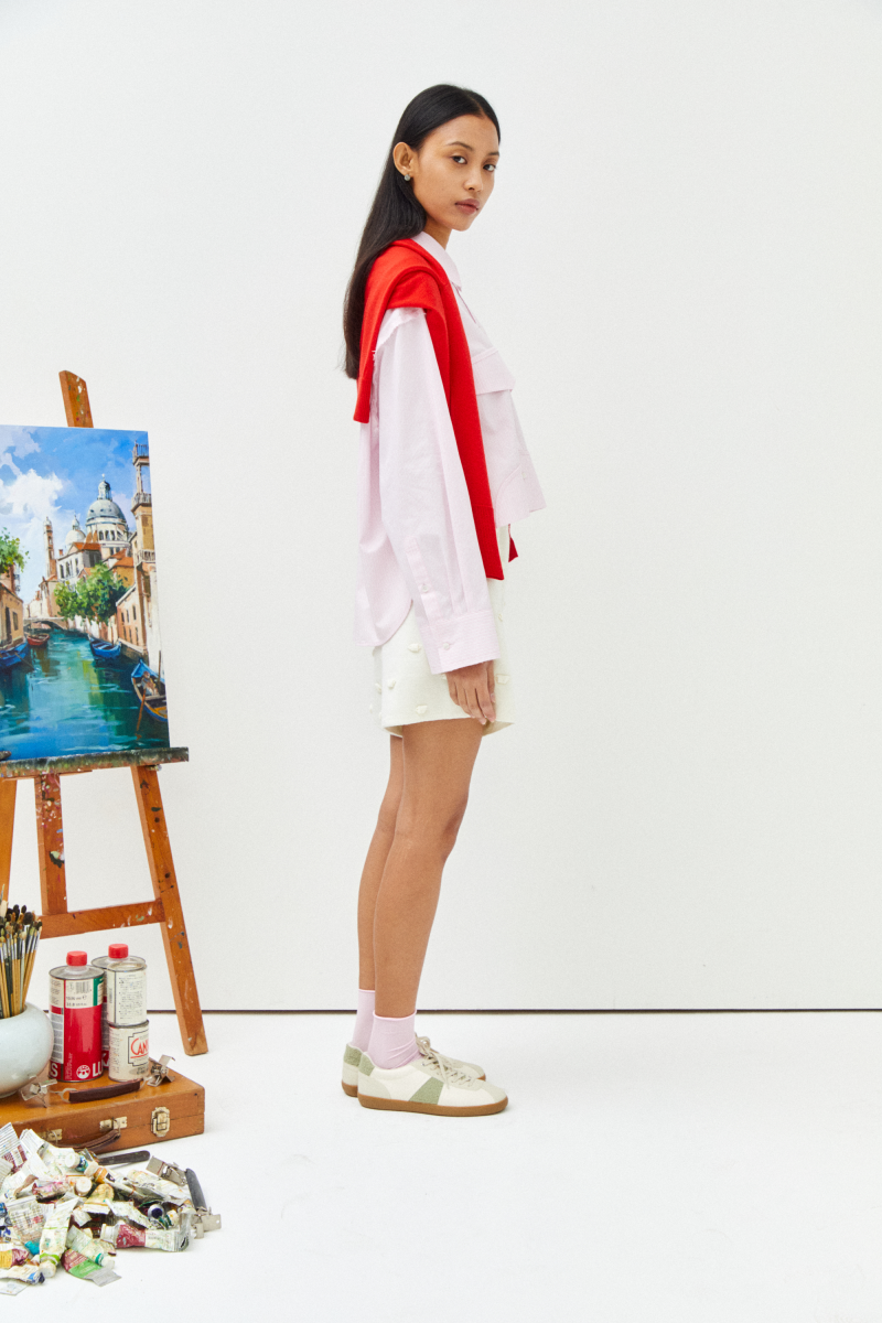 -짧게 뒤집힌 앞판과 긴기장의 뒷판 부조화의 조화를 보여주는 언발란스한 실루엣이 특징적