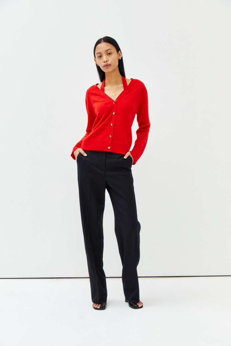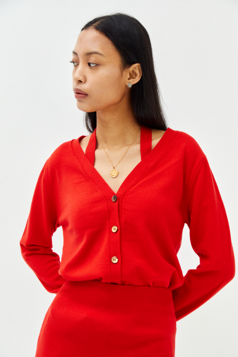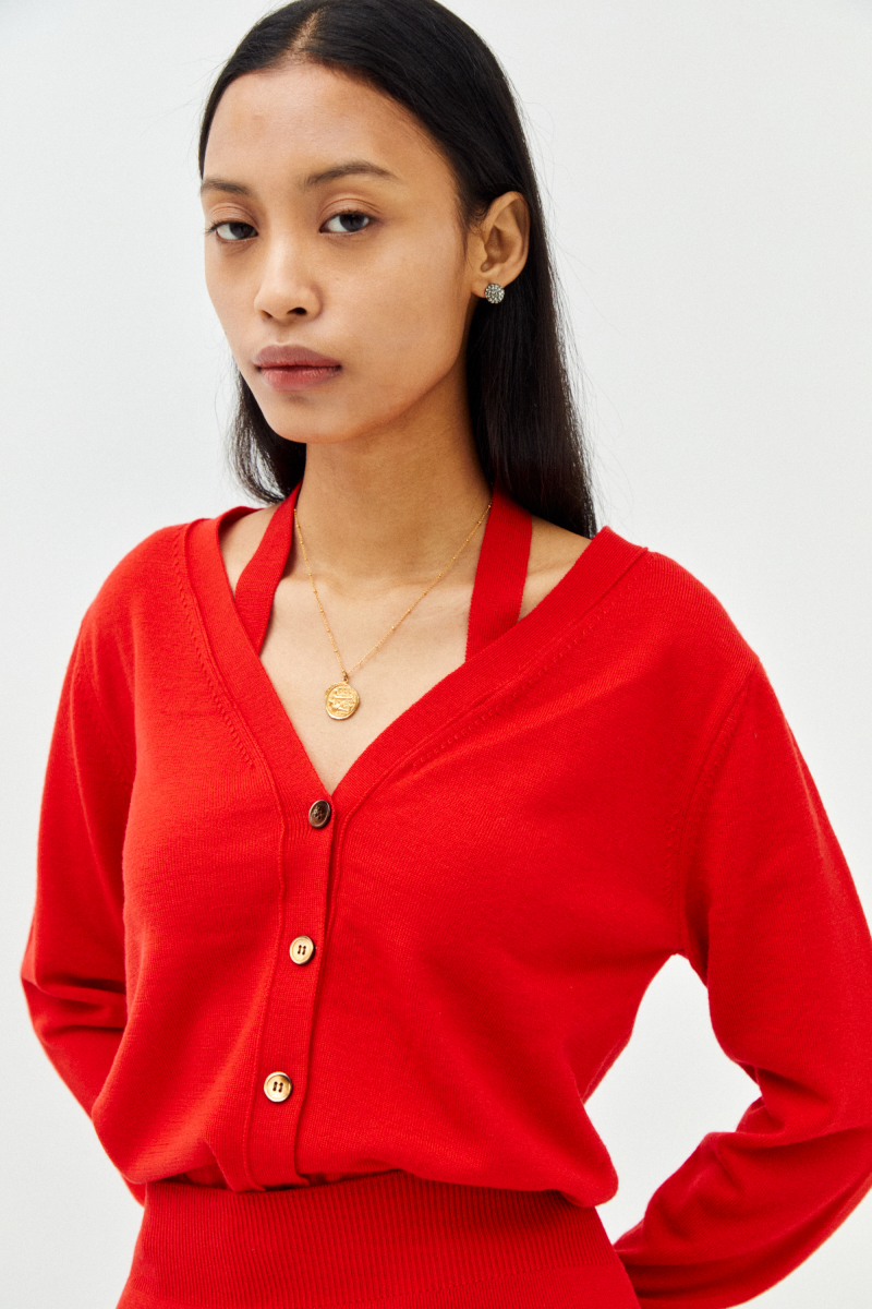 · 센슈얼한 홀터넥 디테일과 소매트임 디테일이 포인트