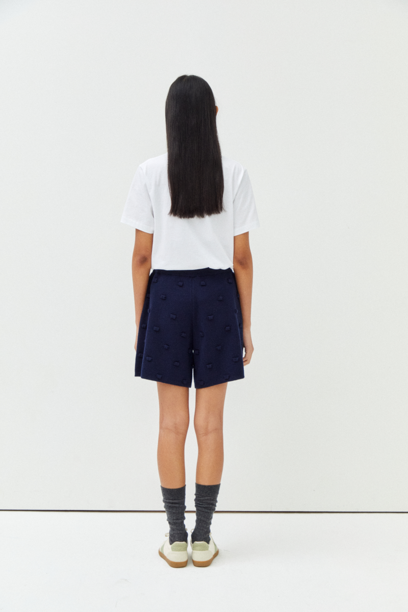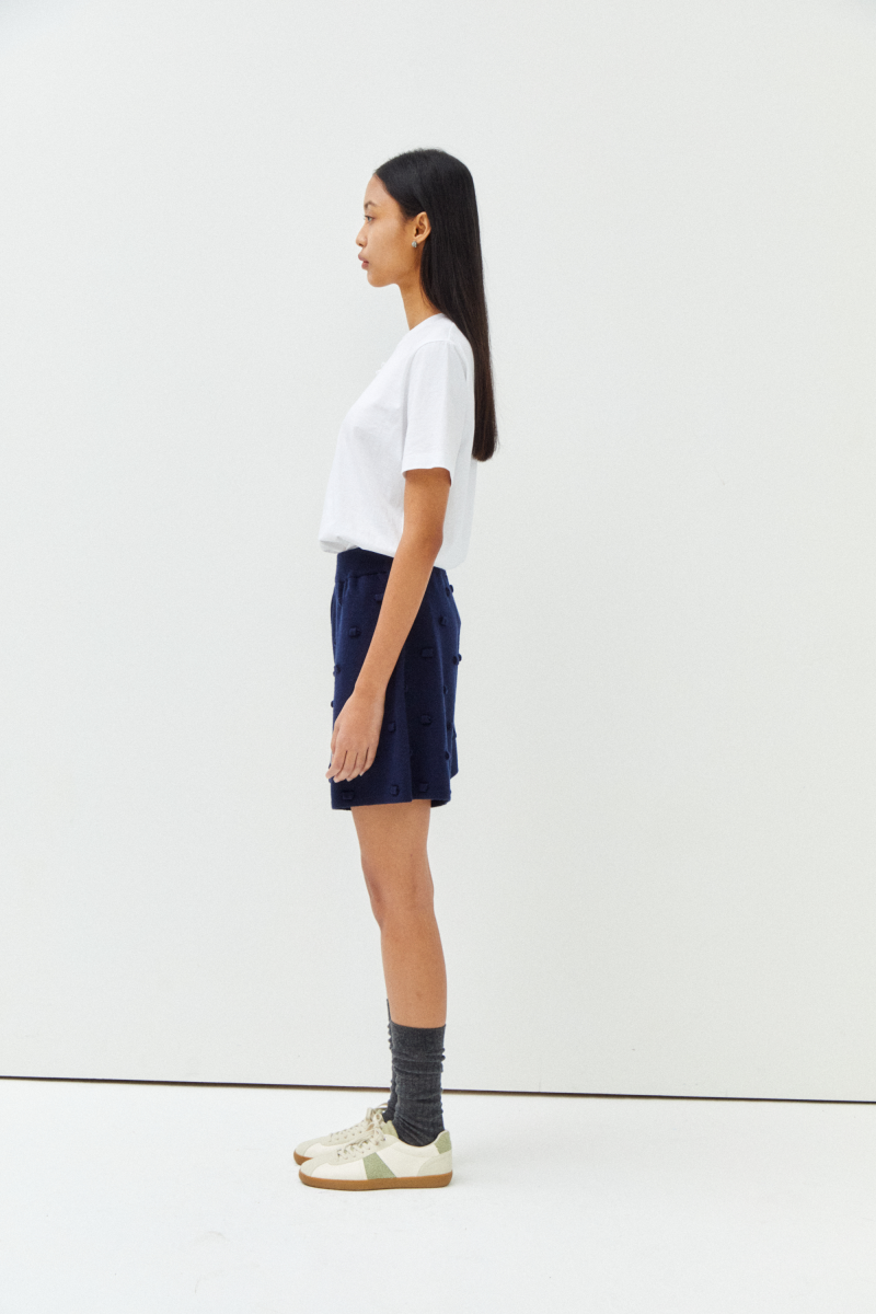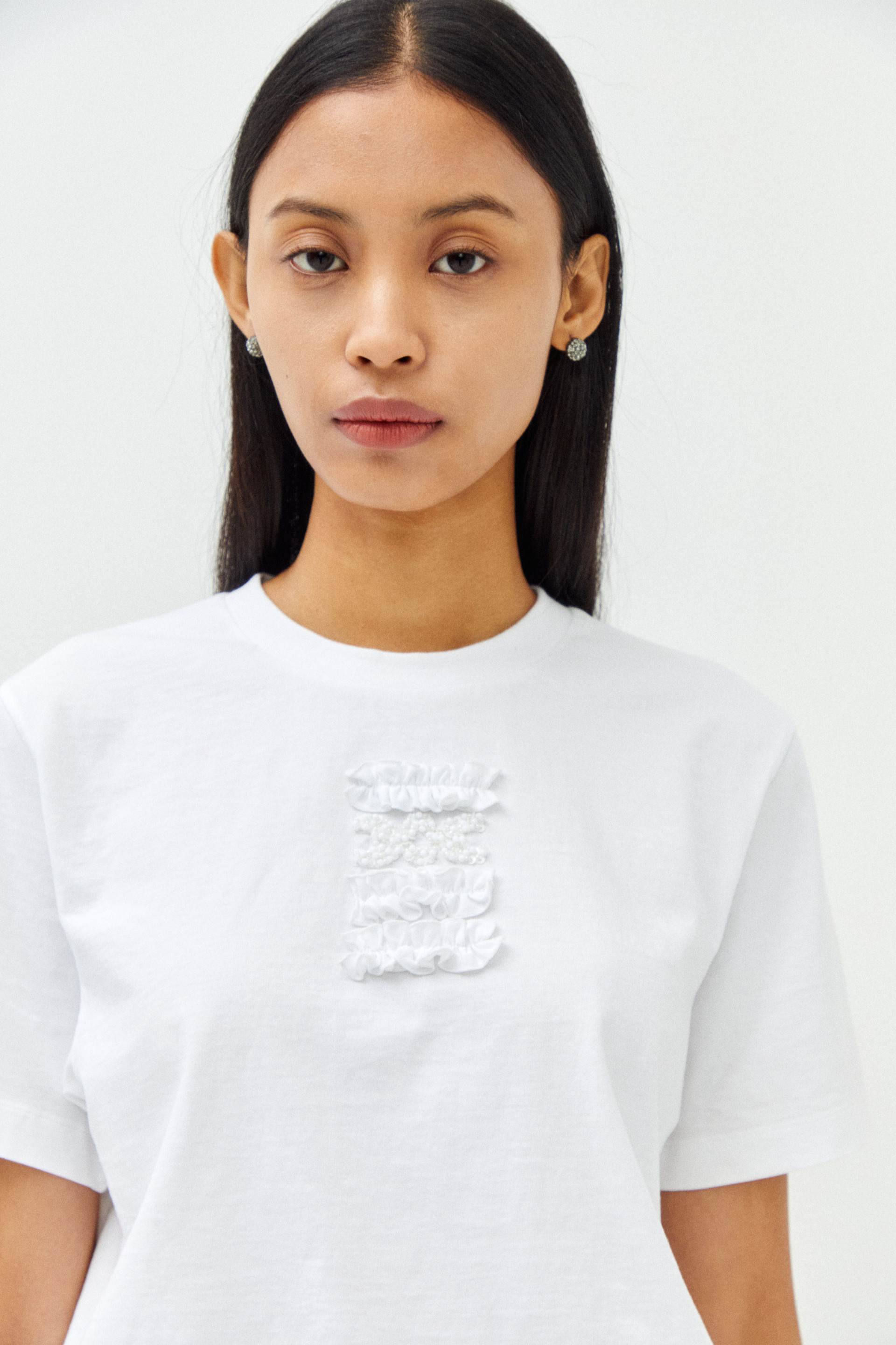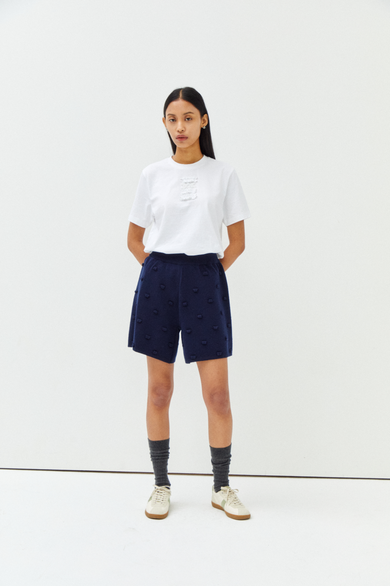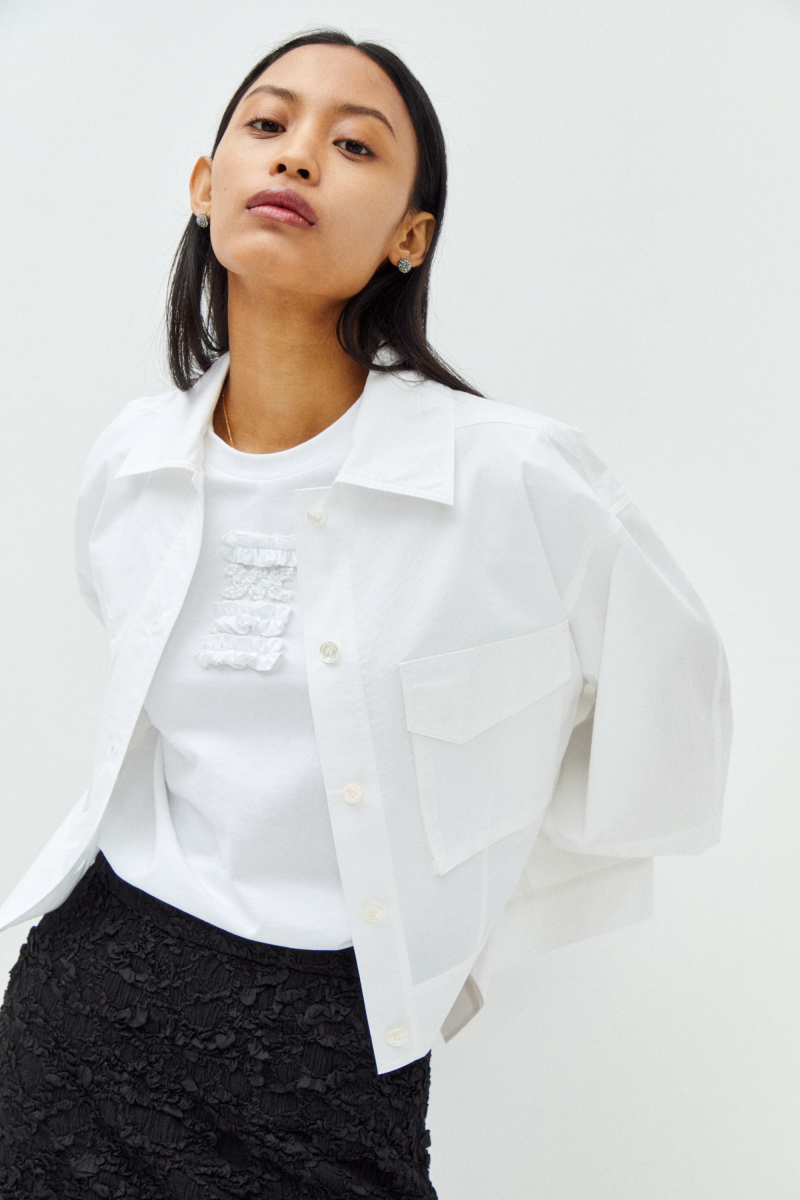 · 꽃 수술을 형상화한 셔링 디테일과 비딩로고의 유니크한 조합이 특징적