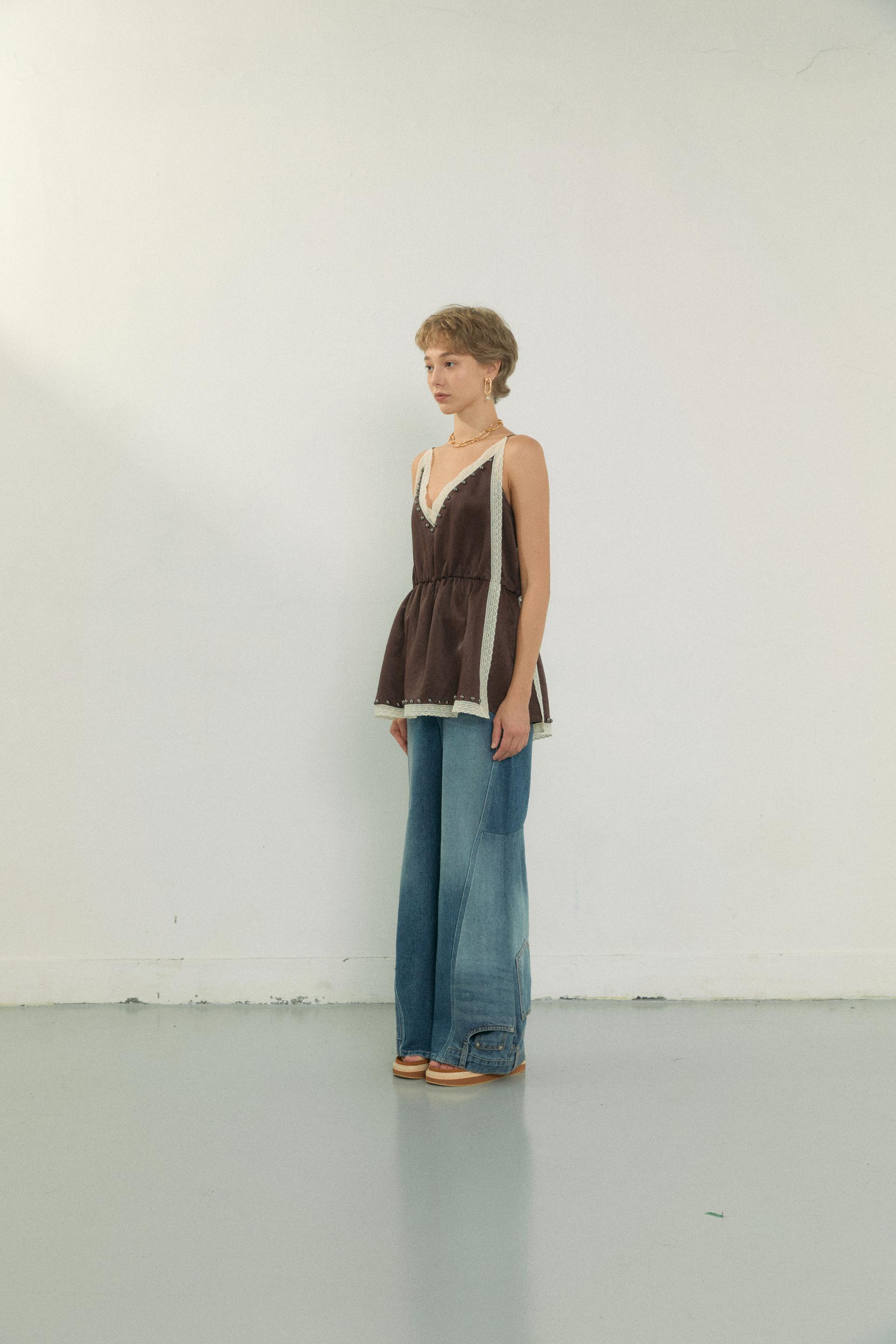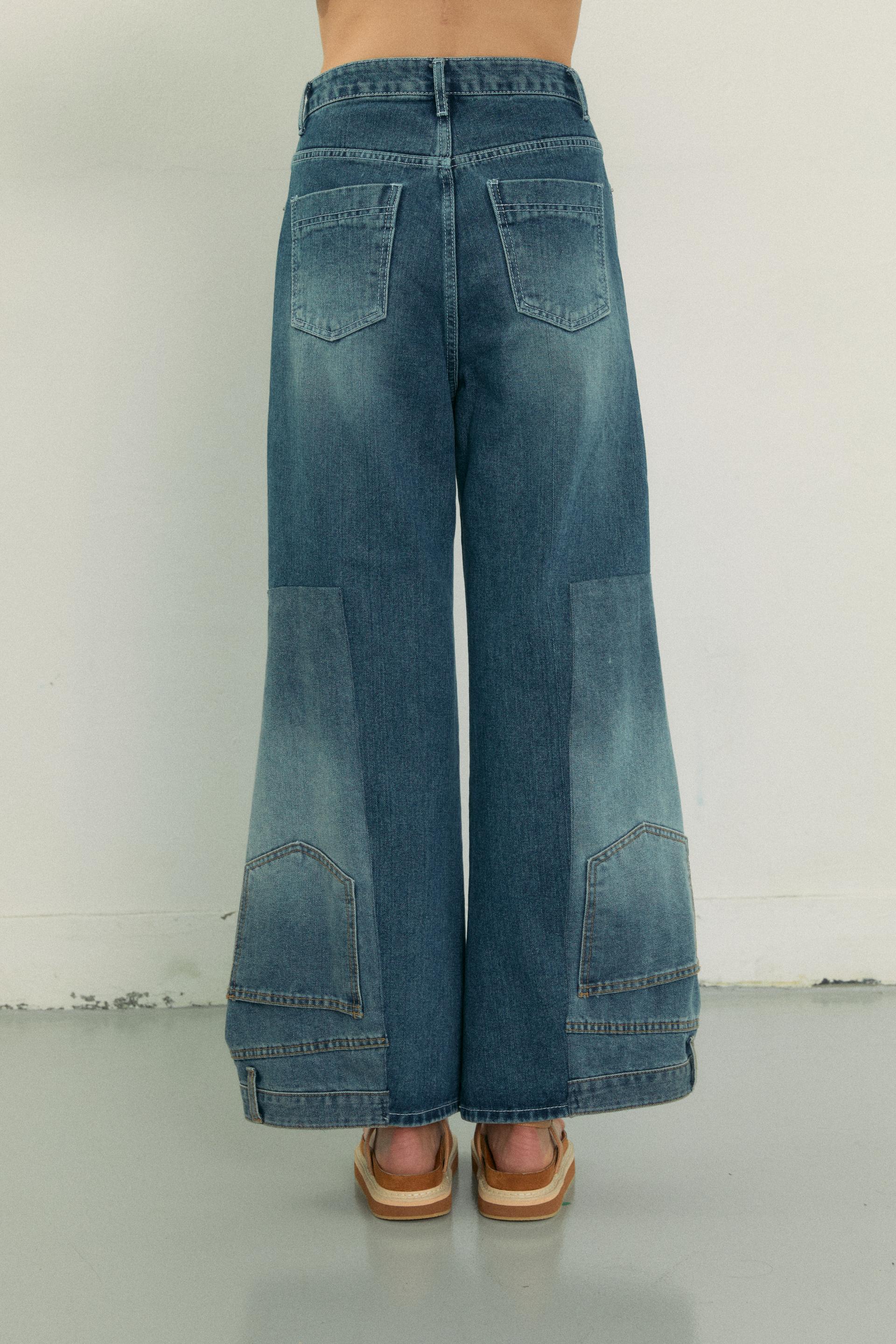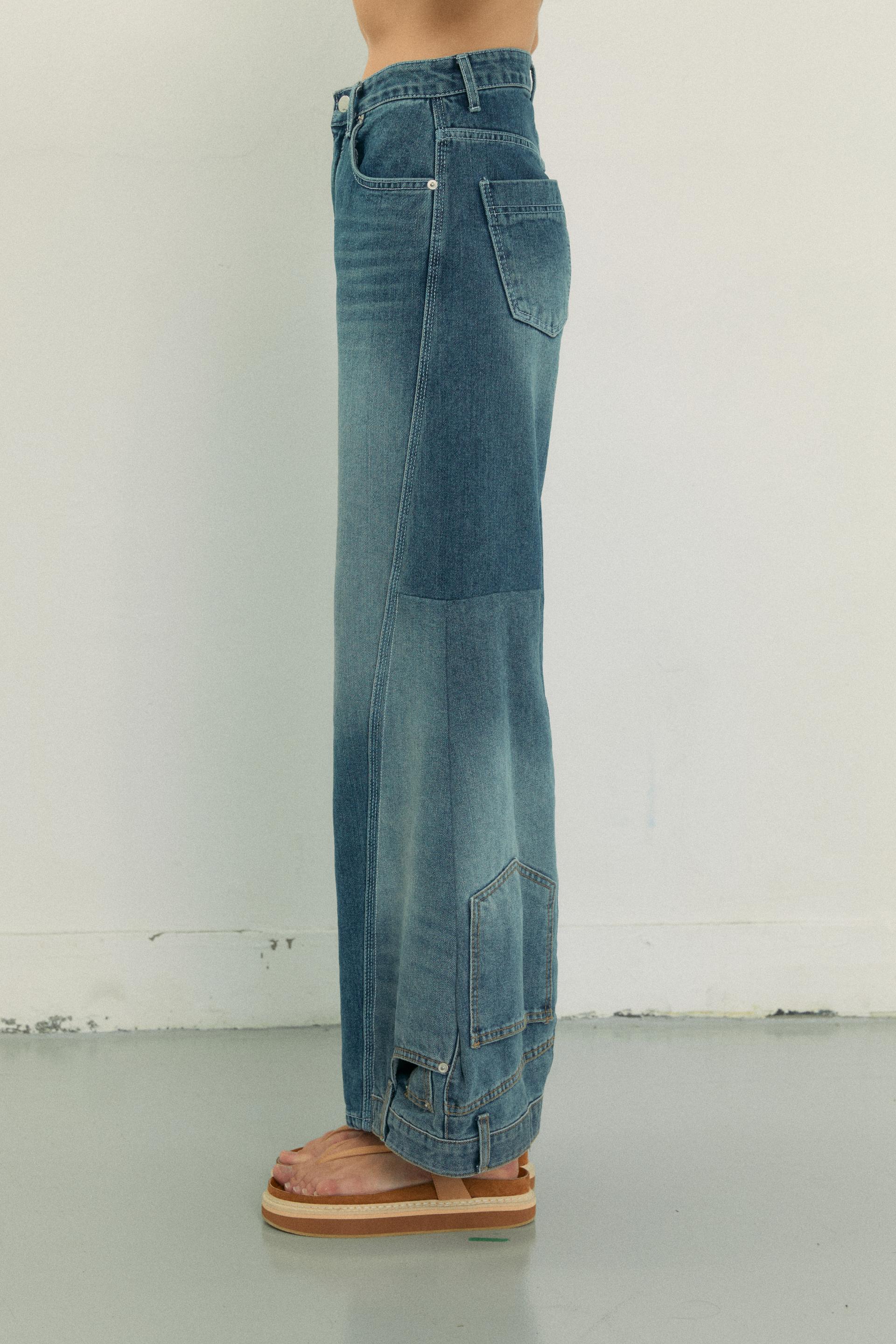 -워싱이 다른 두 종류의 바지를 합쳐서 업사이클링 하여 가치를 높이고자 한 디자인